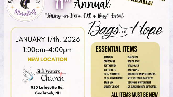 We welcome everyone to join us at the Seabrook location as we host BFA Ministry's annual Bags of Hope event. Our goal this year is to fill 1,000 bags to give to women on the...January 17, 2026BFA Ministry's 11th Annual "Bring an Item, Fill a Bag" EventLocation: Still Waters Church Seabrook